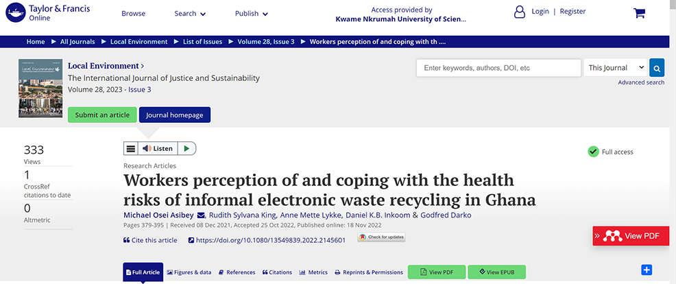 Asibey, M.O., King, R.S., Lykke, A.M., Inkoom, D.K.B., Darko, G., (2023). Workers perception of and coping with the health risks of informal electronic waste recycling in Ghana. Local Environ. 28, 379–395. https://doi.org/10.1080/13549839.2022.2145601